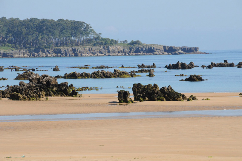 El oleaje de la playa es muy tranquilo y, además, hay un montón de rocas que le dan un aspecto lunar único en la cornisa cantábrica.